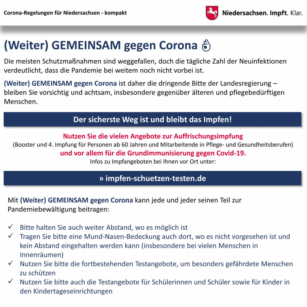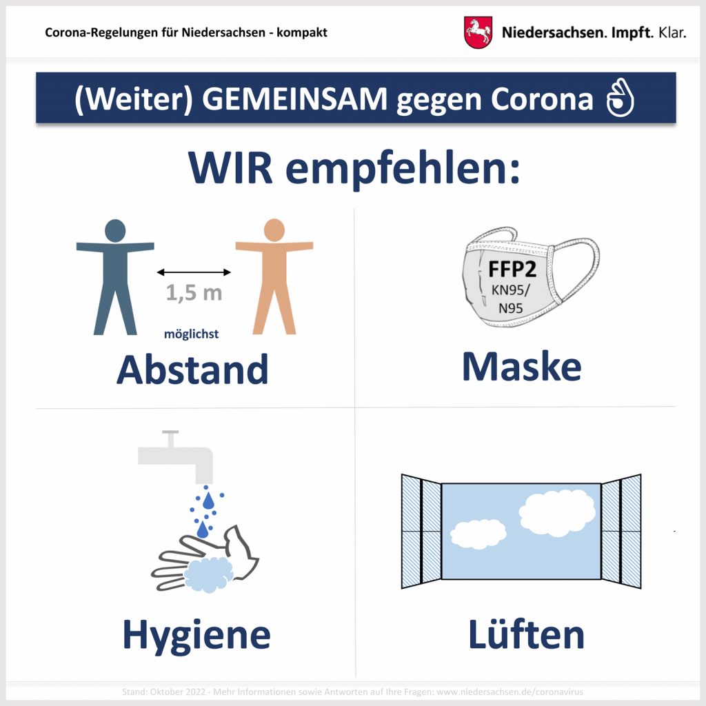 In den nachfolgenden Grafiken sind die aktuellen behördlichen Empfehlungen für das Land Niedersachsen in einer Grafik zusammengefasst. Diese gelten seit dem 1. Oktober 2022.