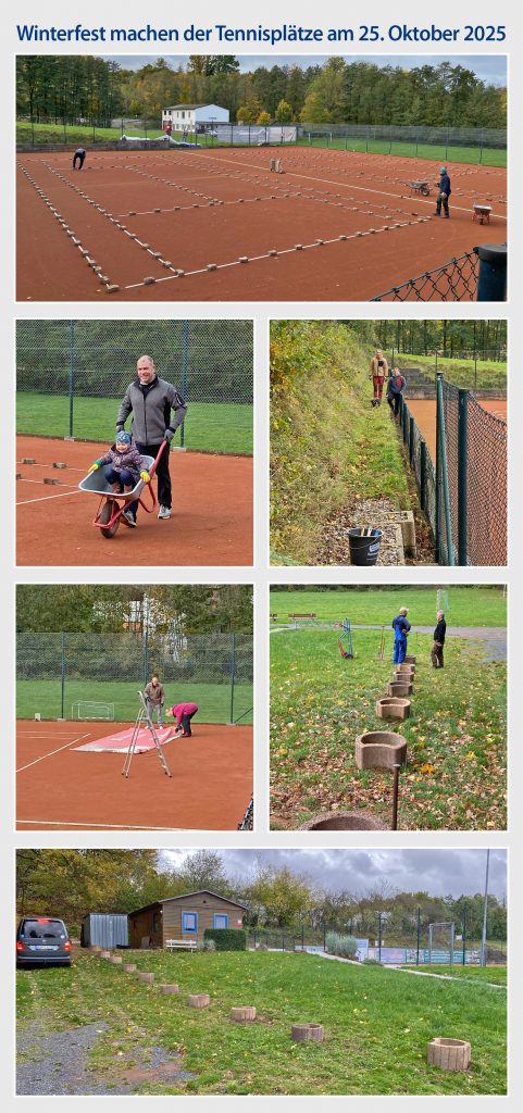 Am kommenden Samstag (02.11.2025) werden noch einige Restarbeiten an der Tennisanlage durchgeführt. Zu diesem Arbeitseinsatz wird allerdings nicht mehr mittels eine Meldeliste in der WhatsApp-Gruppe eingeladen, da sich einige Personen bereits jetzt fest angemeldet haben. Da allerdings eine Menge kleinerer Baustellen abgearbeitet werden könnten, ist jeder, der sich zum Helfen berufen fühlt, herzlich willkommen! Los geht es wie üblich um 10 Uhr, spätestens um 13 Uhr wird der Arbeitseinsatz beendet sein. Danach gibt es – wie eigentlich bei jedem Arbeitseinsatz – eine zünftige Vesper zum Abschluss einer gelungenen Arbeitsmaßnahme.