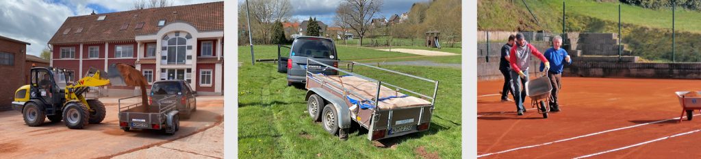 Am Donnerstag, 13. April, wurde wie geplant die erste Ladung Tennissand auf dem Platz 1 aufgebracht. Nachdem bereits in den Mittagsstunden die erste Tonne „Sabacourt“ aus Parensen herangeschafft wurde, konnten pünktlich um 16 Uhr die Arbeiten zum Aufbringen des Tennissandes beginnen. Vier Helfer hatten sich eingefunden, demzufolge liefen die Arbeiten wie am Schnürchen: zwei Leute an der Schubkarre, zwei an der Schaufel … Gut eine Stunde später war die Arbeit vollbracht und der Großteil des Platzes war fertig. Nebenbei erfolgen zunächst an Platz 1 die weiteren obligatorischen Arbeiten, damit er am 1. Mai bereits in einem gut bespielbaren Zustand ist: walzen, abziehen, bewässern, walzen, abziehen, bewässern usw.