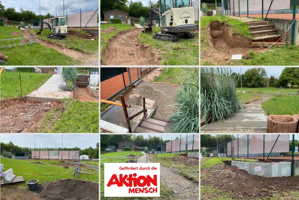 Wie es bereits mehrfach vermeldet wurde, wird der Zugang zu unserer Tennisanlage dank der Unterstützung durch die „Aktion Mensch“ nun endlich barrierefrei. Die Baumaßnahmen haben am 27. Mai begonnen und sollen spätestens am 5. Juni abgeschlossen sein. Danach gilt es nur noch, einige Verschönerungsarbeiten durchzuführen. Auch werden in einigen Bereichen des Zugangs zur Terrasse zwei Handläufe für zusätzliche Sicherheit sorgen.