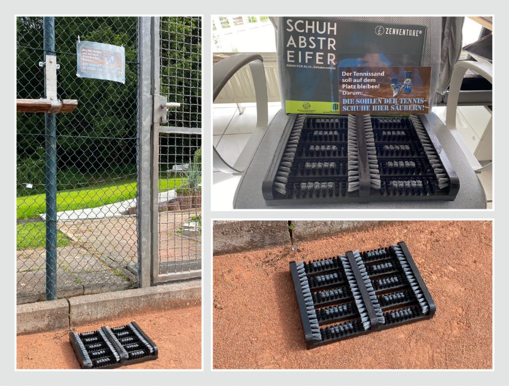 Aus diesem Grunde wurde an der Eingangstür zu den Tennisplätzen jetzt ein Schuhabstreifer aufgestellt. Alle Aktiven werden gebeten, ab sofort den Abstreifer zu nutzen, wenn sie die Tennisplätze verlassen. Wenn sich alle Spielerinnen und Spieler an diese Vorgaben halten, sollte es uns auf diese Weise gelingen, die Verschmutzung der Terrasse durch Tennissand auf ein Minimum zu reduzieren. Wir hoffen auf die Einsicht aller Beteiligten und eine konsequente Umsetzung dieser Bitte! Tragt bitte alle dazu bei, dass unsere wirklich schön gewordene Terrasse auch weiterhin und für einen langen Zeitraum sehenswert bleibt!