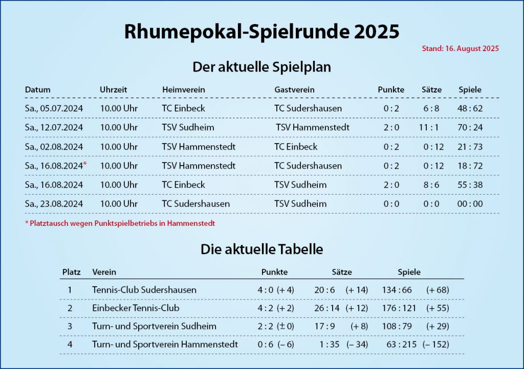 Am kommenden Samstag treten dann die Sudheimer Tennisfreunde ab 10 Uhr bei uns in Sudershausen zum entscheidenden Rhumepokalspiel an. Aktuell hat unser Team die besten Chancen auf den Pokalgewinn, allerdings haben auch die Mannschaften aus Einbeck und aus Sudheim noch die Möglichkeit, den begehrten Pokal für sich zu gewinnen. Unsere Truppe braucht also noch einmal eine geschlossen gute Mannschaftsleistung, um das Ziel „Rhumepokal-Sieg 2025“ zu realisieren. Entgegen dem Turnierverlauf im vergangenen Jahr, als Einbeck sehr frühzeitig als Pokalsieger feststand, bleibt die Entscheidung über den Pokalgewinn in diesem Jahr spannend bis zum letzten Ballwechsel.