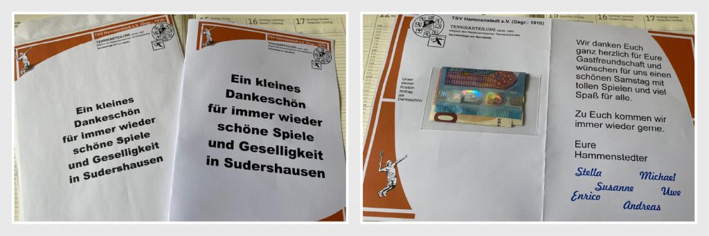 Wie es bei allen Spielen der Rhumepokal-Spielrunde üblich ist, wird das Gästeteam vom gastgebenden Verein vollständig verköstigt und mit den verschiedensten Getränken vor, während und – vor allem auch – nach den Spielen versorgt. Im Gegenzug revanchiert sich das Gästeteam dann fast immer mit einer kleinen Spende. Die Hammenstedter Tennisfreunde hatten sich dazu etwas ganz Besonderes ausgedacht und eigens eine kleine Grußkarte entworfen. Darum auch an dieser Stelle ein dickes Dankeschön und ein großes Kompliment für so viel Enthusiasmus und Liebe zum Detail!