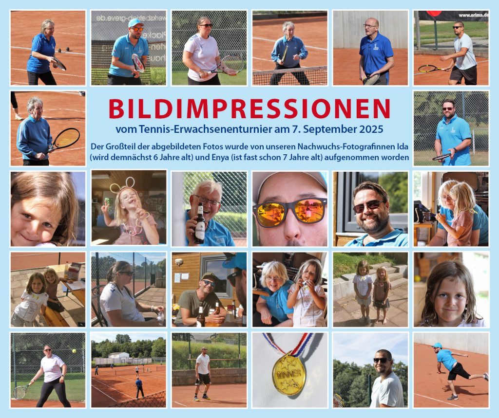 Natürlich war auch für das leibliche Wohl aller Aktiven und der anwesenden Zuschauer gesorgt. Bei leckeren Spezialitäten vom Grill, Pommes und Salaten kam jeder auf seine Kosten, zudem gab es zur Kaffeezeit wieder Sylvias leckeren Blechkuchen. Und wie alle anderen Veranstaltungen zuvor endete der Tennistag am späten Nachmittag mit reichlich Tennis-Fachsimpelei und dem einen oder anderen Kaltgetränk auf der Terrasse unserer Tennisanlage. Und ganz zum Schluss gilt es noch von einem weiteren Novum zu berichten. Der Turnierablauf wurde von den beiden „Nachwuchs-Fotografinnen“ Ida und Enya bildlich festgehalten. Eine kleine Kollektion ihrer Fotos gibt es hier im Anschluss zu sehen.