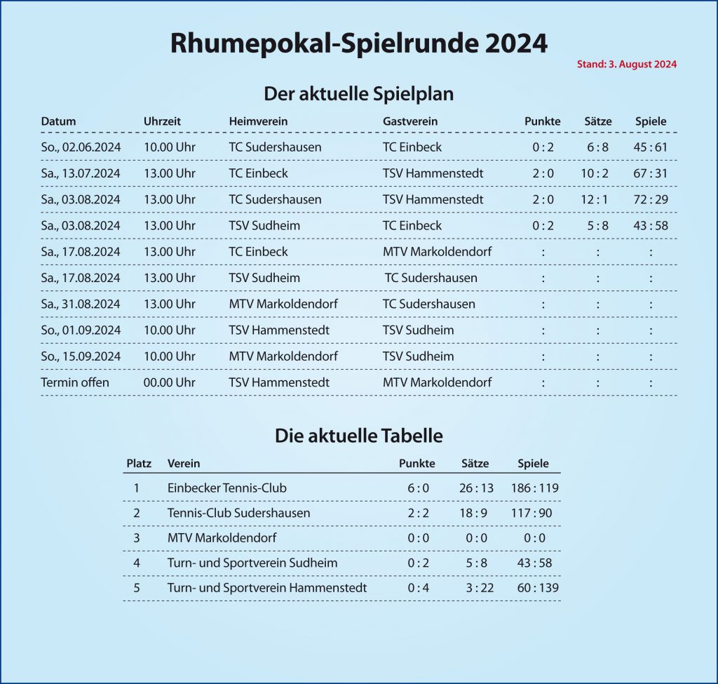 Bereits in zwei Wochen findet für unsere Mannschaft der nächste Spieltag statt. Am 17. August reist unser Rhumepokal-Team zu den Tennisfreunden nach Sudheim. Dort soll mit einer starken Mannschaftsleistung versucht werden, durch einen weiteren Erfolg den zweiten Tabellenplatz hinter den ungeschlagenen Einbeckern zu verteidigen. Weitete zwei Wochen später geht die Reise dann nach Markoldendorf. Dort tritt unser Team zum vierten und letzten Rhumepokalspiel des Jahres an.