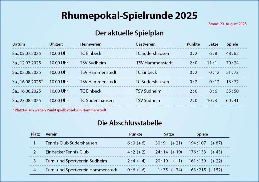 Am Endergebnis änderte das nicht mehr viel. Unsere Mannschaft hatte sich nach dem Spielende dank einer starken Teamleistung mit 10:3 Sätzen durchgesetzt. Als einziger Verein, der ohne Verlustpunkt durch die Spielserie gegangen ist, gebührt unseren Spielerinnen und Spieler völlig verdient der Pokalgewinn. Dieser wird am 3. Oktober im Rahmen unseres Saisonabschlussturniers auf unserer Tennisanlage an die siegreiche Mannschaft übergeben.