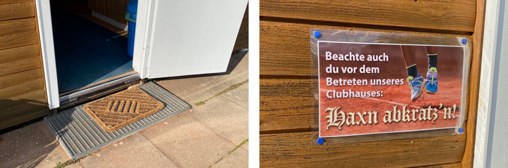 Seit Mitte der letzten Woche prangt ein neues Schild neben der Eingangstür unseres Clubhauses. Es weist in freundlicher Art und Weise darauf hin, dass man doch bitte seine Tennisschuhe vom Sand befreien soll, bevor man das Clubhaus betritt. Leider halten sich nur die wenigsten an diese Regel, die eigentlich eine Selbstverständlichkeit sein sollte. Aslo bitte: Ab sofort vor dem Betreten des Clubhauses „Haxn abkratzn!“ Und damit es nun wirklich keinen Grund zur Ausrede mehr gibt, wurde sogar eine neue Fußmatte angeschafft …