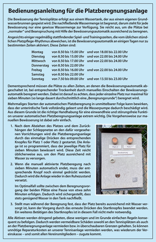 Angesichts des Umstands, dass an einigen Tagen ein mehrstündiges Tennistraining oder auch Mannschafts-Trainings stattfinden, wurde die Bewässerung zu diesen Zeiten ausgesetzt. Kürzlich wurden alle Mitglieder darüber informiert, welche Zeiten zur Platzbewässerung momentan gelten. Vorsorglich wurden sie jetzt auch schriftlich in der Bedienungsanleitung für die Platzberegnungsanlage verankert. Diese ist auf der Tennisanlage neben dem Beregnungs-Schaltkasten ausgehängt. Zusätzlich steht sie auch hier auf unserer Homepage in der Rubrik „Formulare“ als aktualisiertes PDF zum Download bereit.