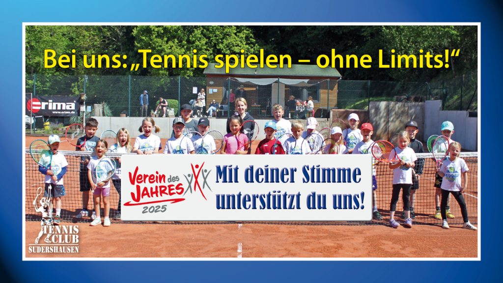 Zurzeit wird die Bewerbung unseres Vereins vorbereitet. Beim Wettbewerb im Jahr 2023 waren es drei Bildkollagen, auf denen die Vorzüge unseres Vereins im Ganzen angepriesen wurden. Seitdem hat sich in unserem Vereinsleben einiges verändert – vor allem im Bereich der Jugendarbeit. Aus diesem Grund liegt der Schwerpunkt unserer Kandidatur beim diesjährigen Wettbewerb beim Thema Jugend, denn nur wenige Vereine können mit dem sehr attraktiven Angebot unseres Vereins konkurrieren. Natürlich bleiben auch die weiteren Vorzüge unseres Vereinslebens nicht unerwähnt. Insgesamt gibt das Bewerbungsvideo einen ausführlichen Überblick über die Vorzüge unserer Sudershäuser Tennisgemeinschaft. Darum hoffen wir, auch Votings aus anderen Regionen zu bekommen. In erster Linie ist es jedoch die Aufgabe aller Vereinsmitglieder, im Freundes- und Bekanntenkreis für unseren Verein kräftig die Werbetrommel zu rühren. Ab dem 1. Oktober gilt das Motto: Jede Stimme für den Tennis-Club Sudershausen!