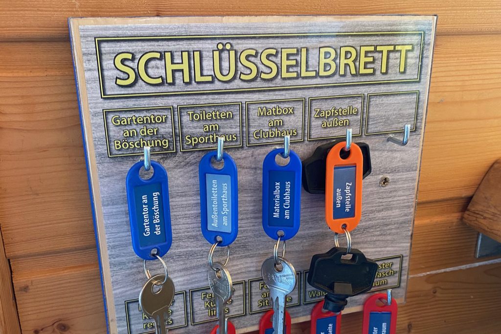 Im Clubhaus wurde jetzt ein neues übersichtliches Schlüsselbrett installiert, an dem sich alle für den Tennisalltag wichtigen Schlüssel befinden. Es befindet sich im Küchenbereich, unmittelbar neben der Theke. Alle Aktiven finden dort – übersichtlich geordnet – den Schlüssel für die Tür an der Böschung, den Schlüssel für die Außentoiletten am Sporthaus, den Schlüssel für die Matbox sowie sämtliche Schlüssel für die abschließbaren Fenster im Clubhaus. Es versteht sich von selbst, dass sämtliche Schlüssel nach der Benutzung wieder an der richtigen Stelle aufgehängt werden. Bislang hat das in vorbildlicher Weise funktioniert …