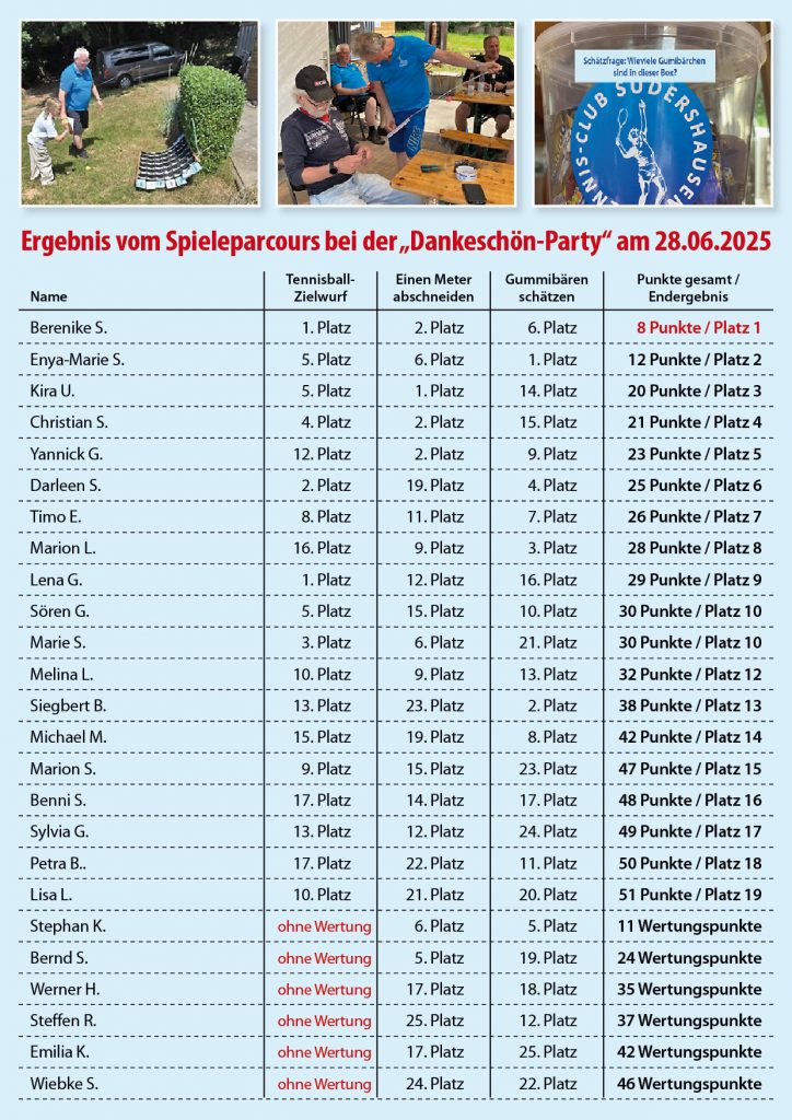 Für die nötige Kurzweil der Gäste war ebenfalls gesorgt. Einige „Unentwegte“ hatten ihre Tennisausrüstung dabei und jagten trotz hochsommerlicher Temperaturen dem gelben Filzball hinterher. Darüber hinaus war vom 1. Vorsitzenden ein amüsantes Unterhaltungsprogramm vorbereitet worden, das den Gästen ebenfalls viel Spaß und Freude bereitete. Im Laufe des Nachmittags war der überwiegende Teil der Anwesenden damit beschäftigt, sich mit verschiedenen Rate- und Geschicklichkeitsübungen auseinanderzusetzen. Eine kleine Überraschung bei der Bekanntgabe des Endergebnisses: Mit Berenike und Enya belegten zwei Mitglieder aus der jüngeren Tennisgeneration die beiden ersten Plätze.