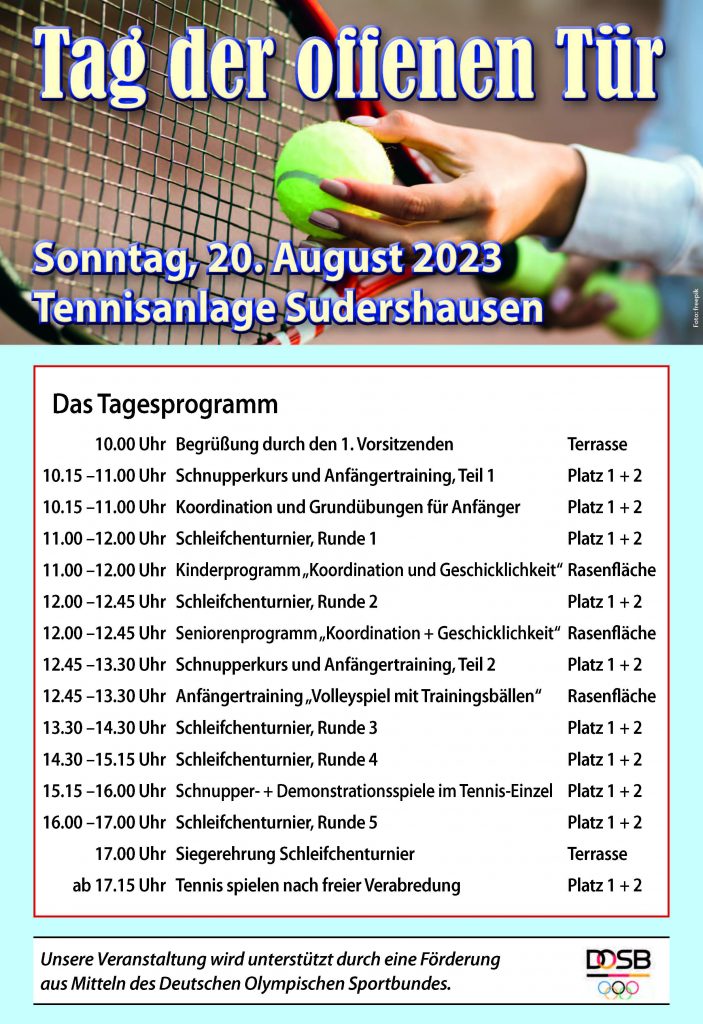 Am kommenden Sonntag findet auf unserer Tennisanlage bekanntlich unser „Tag der offenen Tür“ statt. Nachdem in den letzten Tagen noch an einigen Kleinigkeiten gefeilt wurde, steht der Ablauf des Programms nun endgültig fest. Die Veranstaltung beginnt pünktlich um 10 Uhr und wird ohne größere Unterbrechung bis in den späten Nachmittag andauern. Bei dem bunten Angebot, das die Veranstalter ausgearbeitet haben, ist garantiert für jeden etwas dabei. Besonderes Augenmerk sollten die Gäste unter anderem auch auf das kulinarische Angebot legen, denn auch hier betritt unser Catering-Team mit neuen Produkten in einigen Bereichen Neuland. Man darf also gespannt sein …