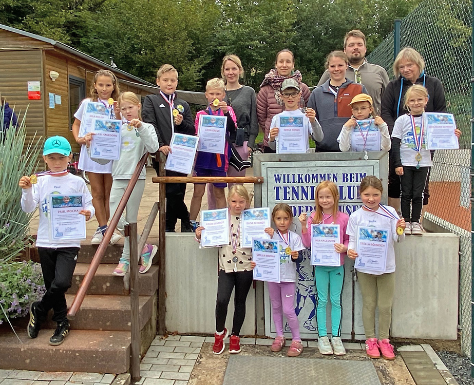 Im Rahmen einer abwechslungsreichen Tennis-Olympiade, bei der Geschicklichkeit, Balltechnik und Ausdauer gefragt waren, feierten insgesamt 13 Tenniskids am 27. September den Abschluss des Freiluft-Tennistrainings auf der vereinseigenen Tennisanlage in Sudershausen.
