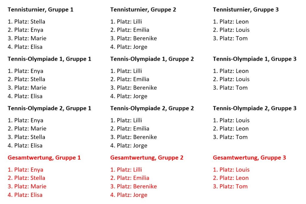 Auf beeindruckende Weise zeigten unsere Tennis-Kids den zahlreichen Zuschauern, welche Fähigkeiten sie in der kurzen Zeit bei ihrer Trainerin Silja bereits erlernt haben. Auch auf den beiden Spielfeldern der Tennis-Olympiade, die von Charly und Sylvia betreut wurden, gaben alle ihr Bestes, um ein gutes Gesamtresultat zu erreichen. Um eine gewisse Chancengleichheit zu erreichen, traten die Mädchen und Jungen in drei verschiedenen Leistungsgruppen an.