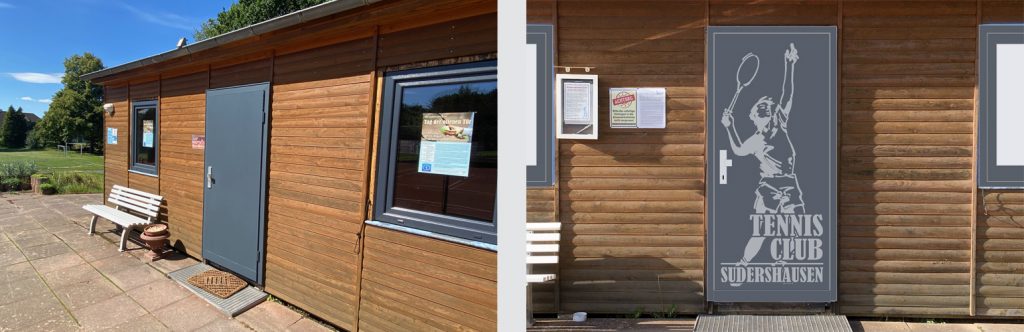 Der neue Farbanstrich und die Wahl des Farbtones haben natürlich ihren Grund. Zum einen harmoniert die Farbe der Außentür nun mit den Fensterrahmen, zum anderen wird die Tür des Clubhauses in absehbarer Zeit durch ein großes Bild zu einer Art „Visitenkarte“ unseres Vereins umgestaltet. Dann wird das Logo unseres Vereins, welches seit Beginn dieses Jahres unter anderem für das Bedrucken von Textilien aus unserer Vereinskollektion verwendet wird, auch die Eingangstür zu unserem Clubhaus verschönern. Die beiden folgenden Bilder zeigen die Außenfassade des Clubhauses im aktuellen Zustand (links), das rechte Bild zeigt in einer Fotomontage, wie die Außentür demnächst aussehen soll …